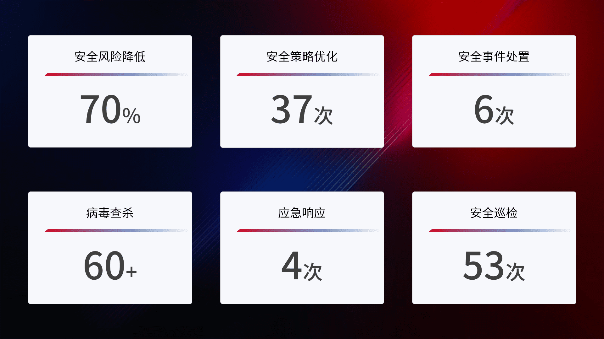 提供全面的安全事件报告体系,,,,包括处置报告、、周报、、、、季度和年度总结,,,,结合持续监控,,,帮助客户深入了解网络安全状况。。。