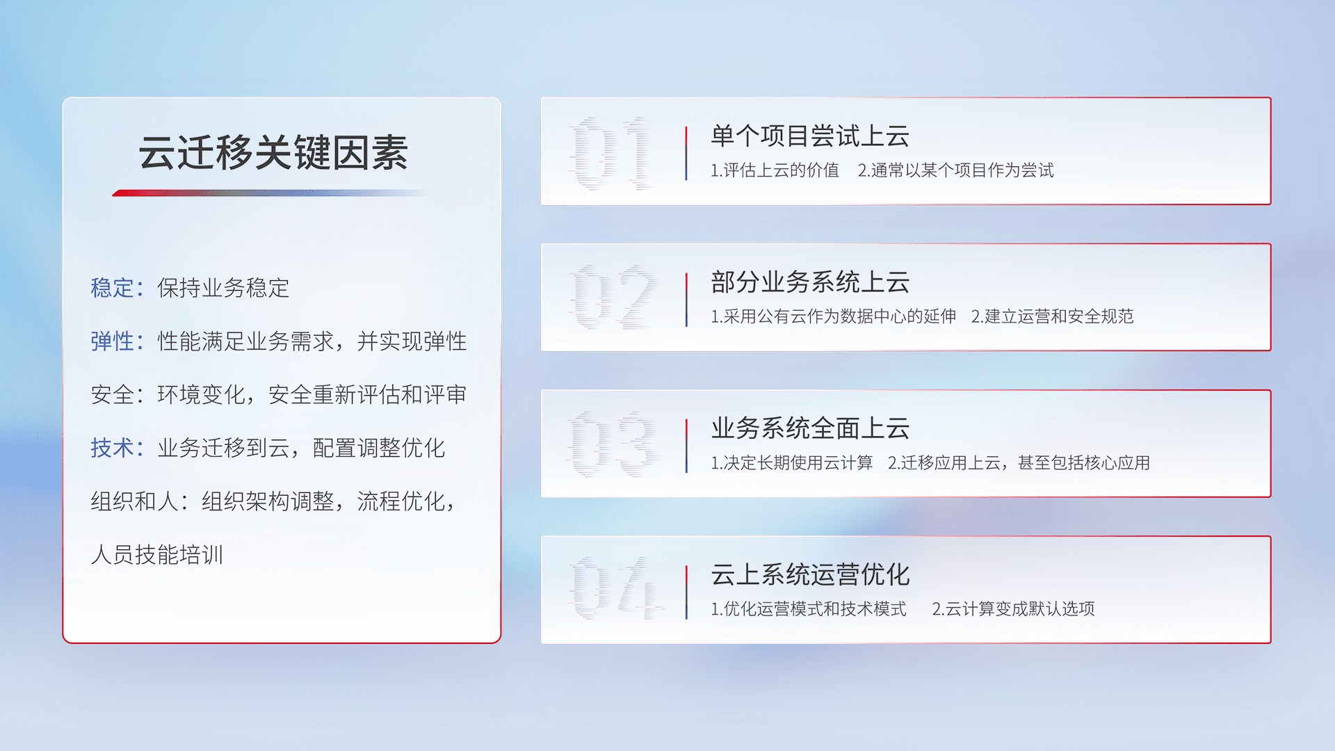 结合实际业务,,,从规划设计、、云平台选型、、、云原生改造、、、、数据迁移、、、、集成交付,,,迁移全过程为客户识别最佳上云路径,,,,做好风险识别管理,,,设计网络架构、、身份权限、、、、安全审计合规、、、、操作审计、、、、日志审计、、、监控告警策略、、多站点容灾设计等,,对云上基础设施进行整体规划,,,提升IT治理水平,,,以满足弹性、、、、高可用、、、、高性能的需求。。
