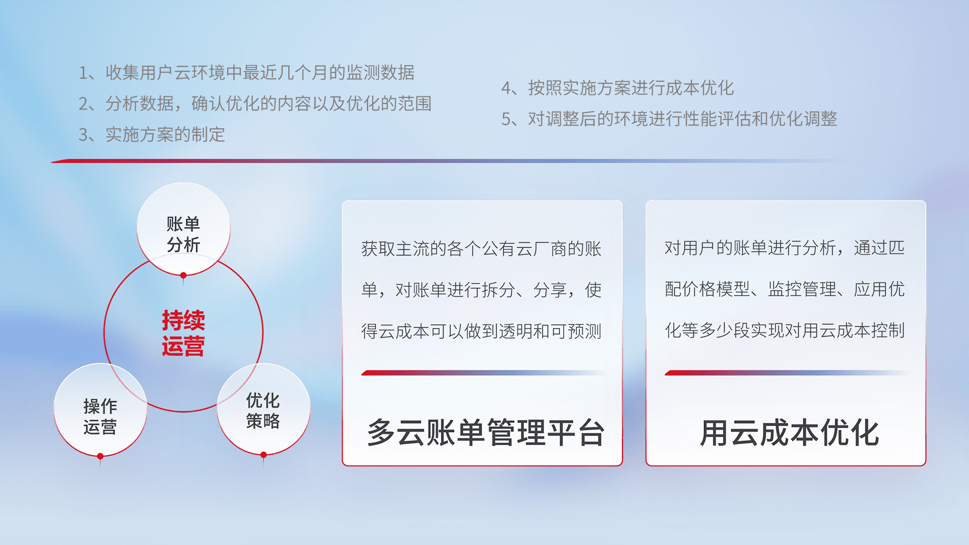 通过多云纳管,,以统一的资源数据模型把客户的云资源进行抽象和封装,,,,进而实现对多云资源的统一操作,,,,保障云资源管理的可靠性、、、稳定性与可用性。。。。量身定制化运维内容,,,,配置、、、开发运维、、、补丁管理、、备份、、监控、、认证和访问管理、、、、审计和日常巡检等,,,保障在用云过程中的可靠度,,,,稳定度以及高可用率。。